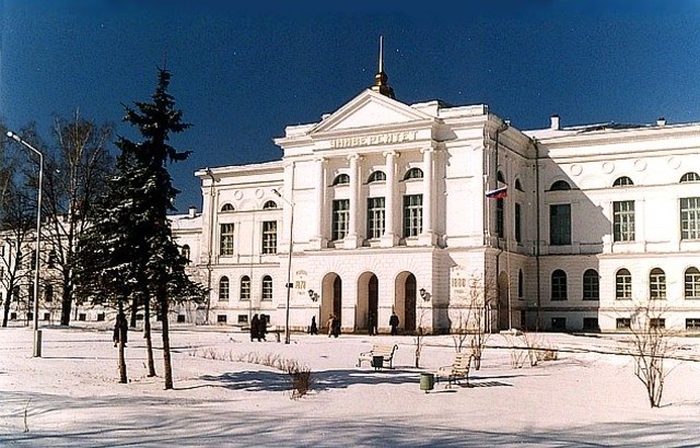 Главный корпус первого за Уралом университета. Основан в 1880 году. Проектированием здания главного корпуса и остальных зданий университета занимался академик А.К.Бруни. Открытие университета состоялось в 1988 году, хотя здание было готово к приему студентов в 1885 году. Колоссальную роль в открытии первого университета Сибири сыграл В.М.Флоринский, который посвятил этому 18 лет жизни, но и удостоен был звания Почетного гражданина города Томска. На втором этаже, на месте нынешнего актового зала располагалась церковь во имя Казанской Божьей Матери