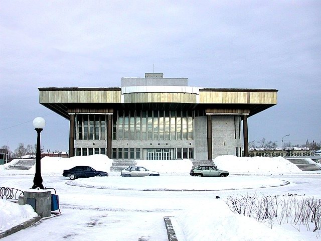 Томский драматический театр, находится на бывшей Базарной площади, ныне пл.Ленина. Построен в начале 80-х годов XX столетия. Томскому театру уже исполнилось 153 года. Первый по времени театр в Томске был открыт в 1850 году. Изначально деревянный и крытый тесом располагался на месте, где сейчас находятся клиники медуниверситета (строительство финансировался золотопромышленником Фелимоновым). Справа вдали видна Воскресенская церковь.